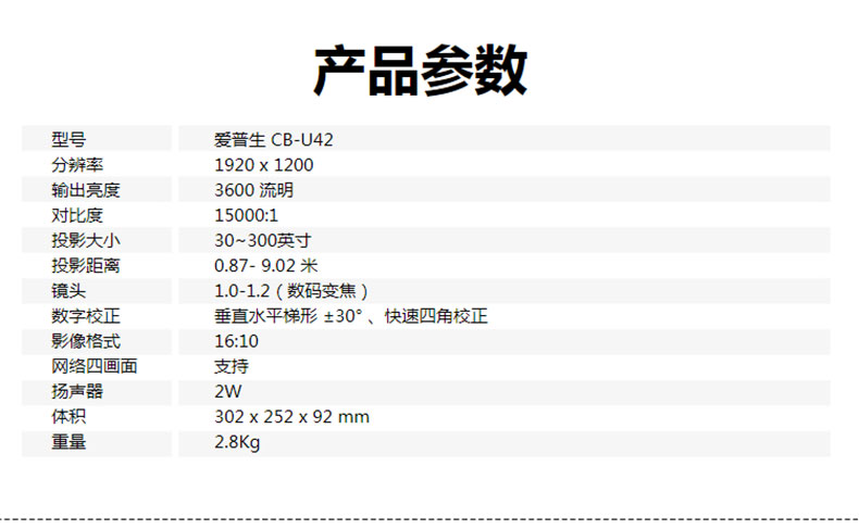 • 產(chǎn)品名稱:愛(ài)普生(EPSON)CB-U42投影儀 高清辦公商務(wù)投影機(jī) 官方標(biāo)配